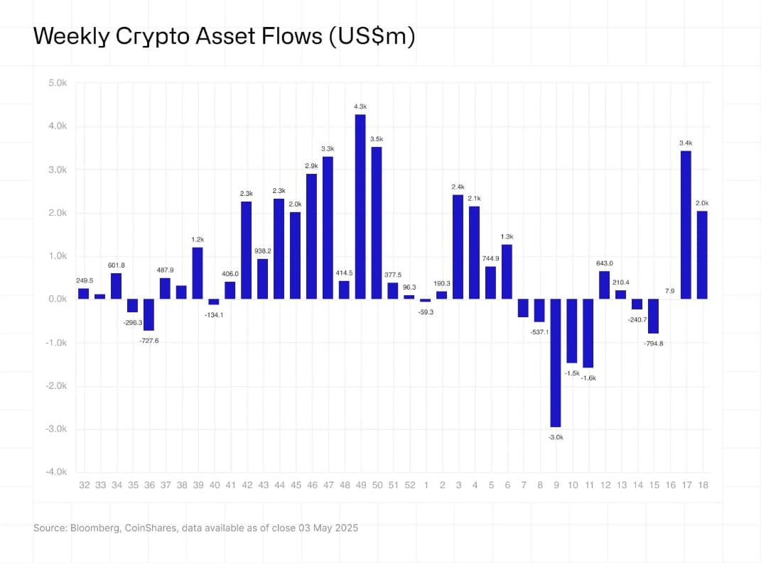 May 5, 2025 — Digital asset investment products have attracted $2 billion in inflows last week, marking the third consecutive week of positive sentiment, according to the latest CoinShares report. This significant influx of capital continues a notable reversal in market dynamics, bringing total inflows over the past three weeks to $5.5 billion and effectively ending a nine-week streak of significant outflows.
